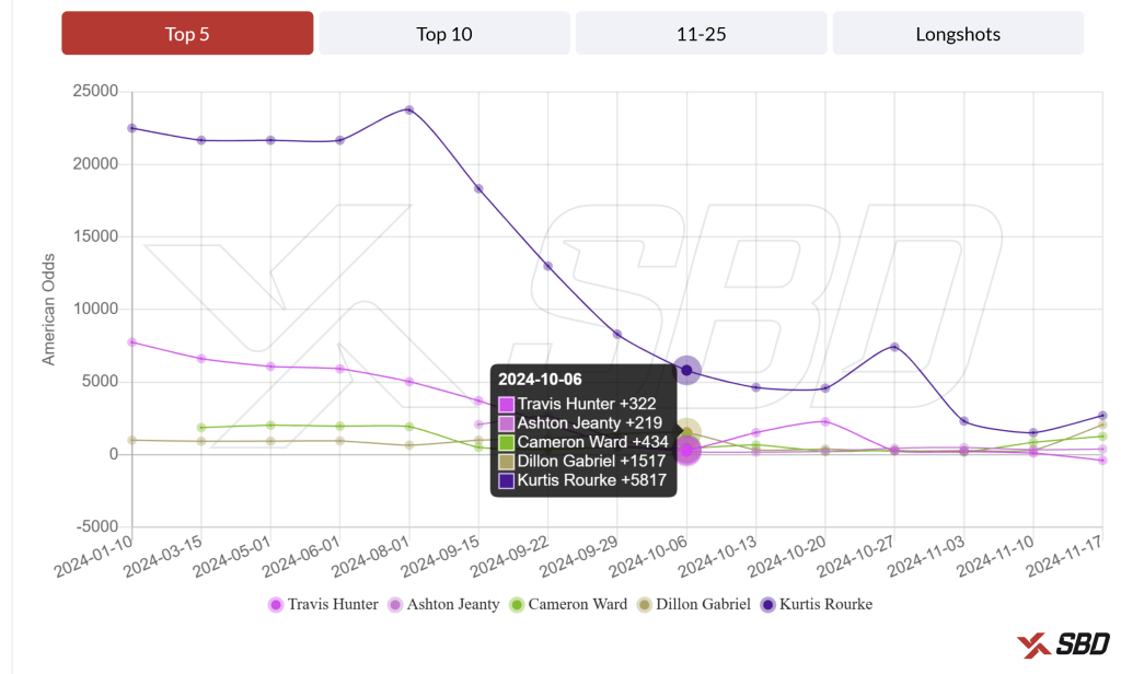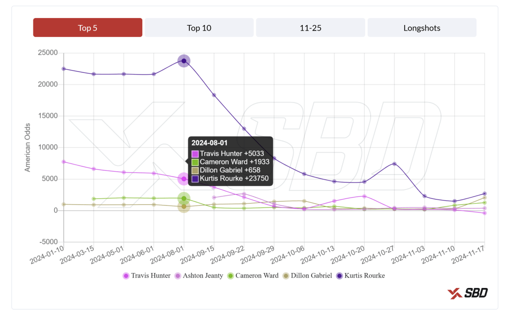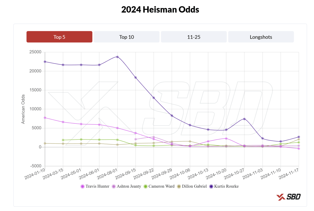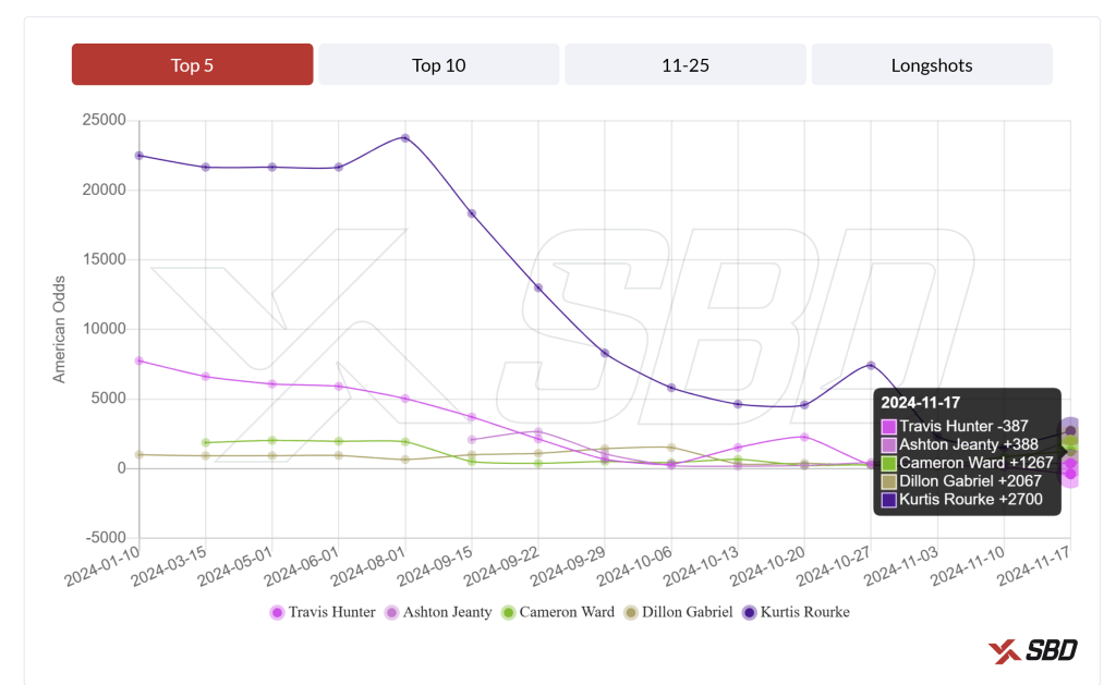 November: As of today, Travis Hunter’s versatility has helped him overtake Jeanty, and Cam Ward’s odds have slipped after inconsistent showings.